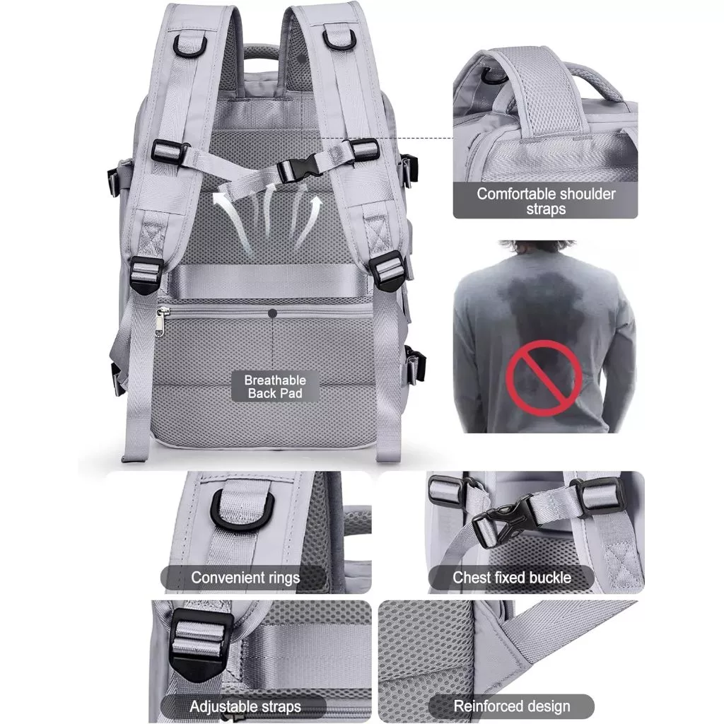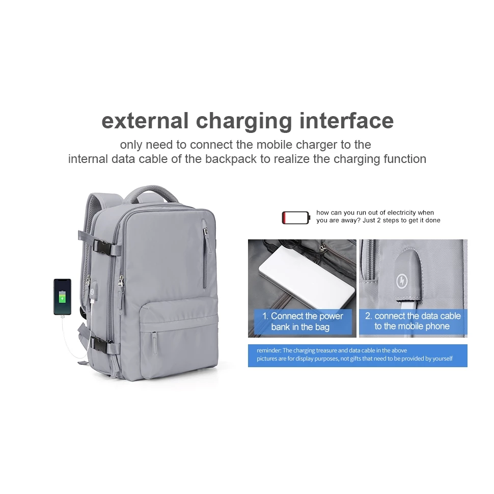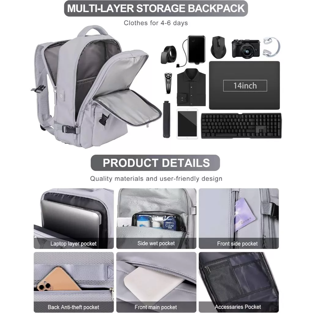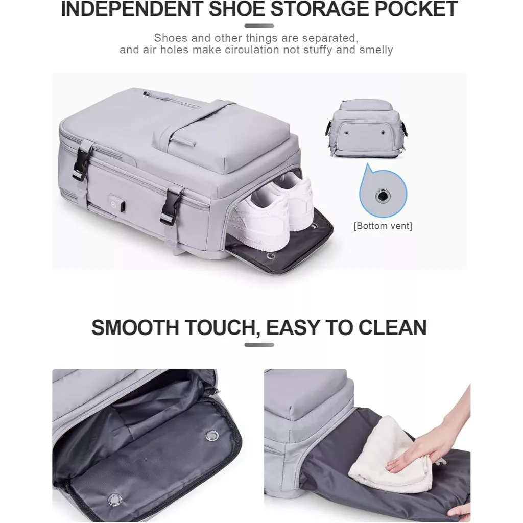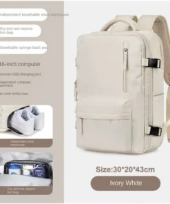 Features: Wet and dry separation bag, independent shoe position, USB interface, constant temperature side bag, breathable sponge back pad, side bag buckle, independent computer compartment